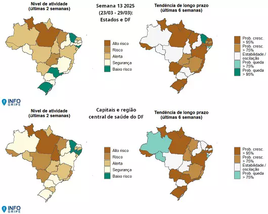 Atualmente, 12 das 27 capitais brasileiras apresentam nível de incidência de SRAG em alerta, risco ou alto risco, incluindo Campo Grande (MS), Brasília (DF) e Palmas (TO), no Centro-Oeste. Entre as capitais de outras regiões afetadas estão Belo Horizonte (MG), Rio de Janeiro (RJ), São Luís (MA), Belém (PA) e Macapá (AP).